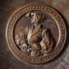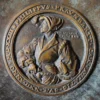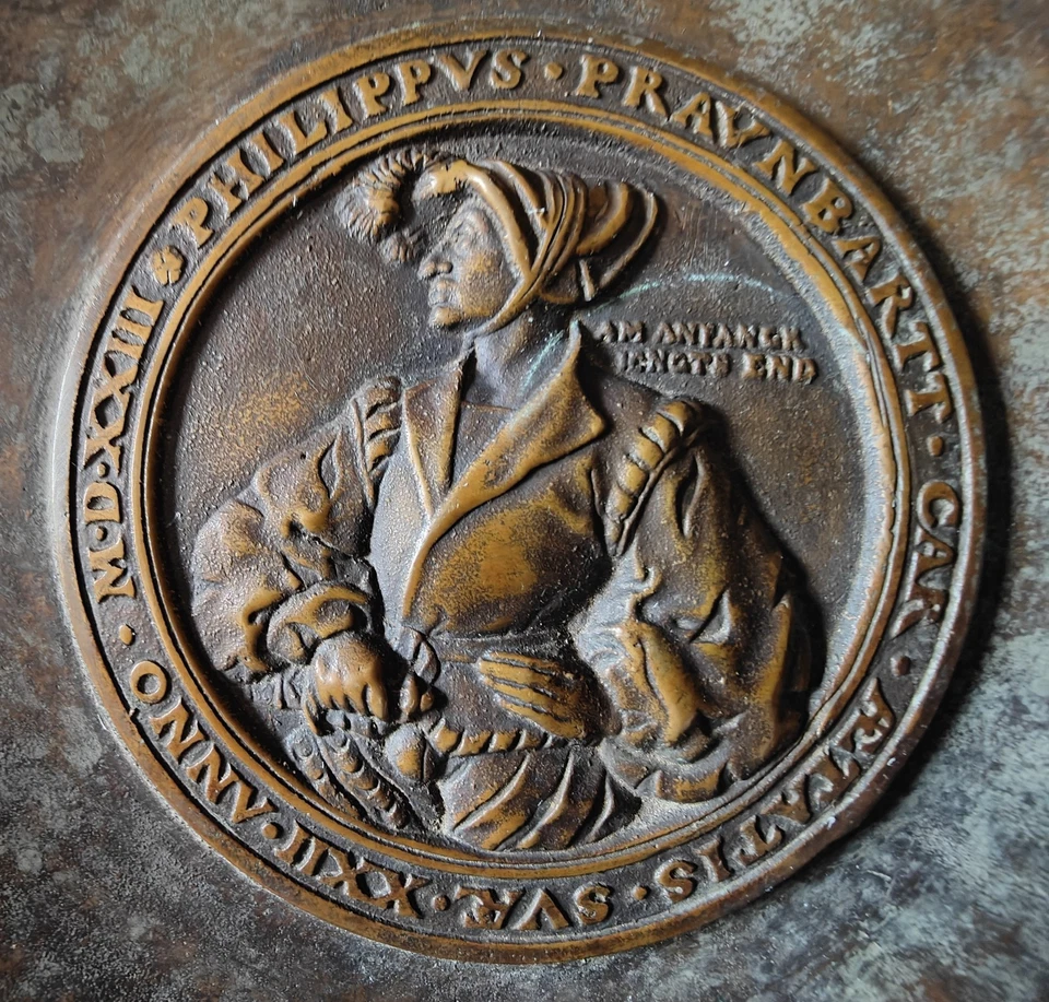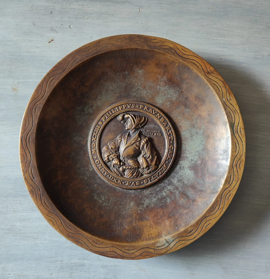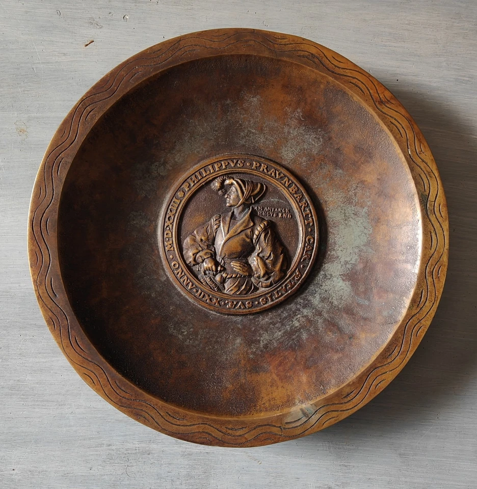 Ein neuzeitlicher Bronze-Teller/Schale in schwerer Qualität mit herrlicher Patina mit dem Medaillon von Philippus Praunbartt nach Bildhauser Hans Dauser (16. Jh).