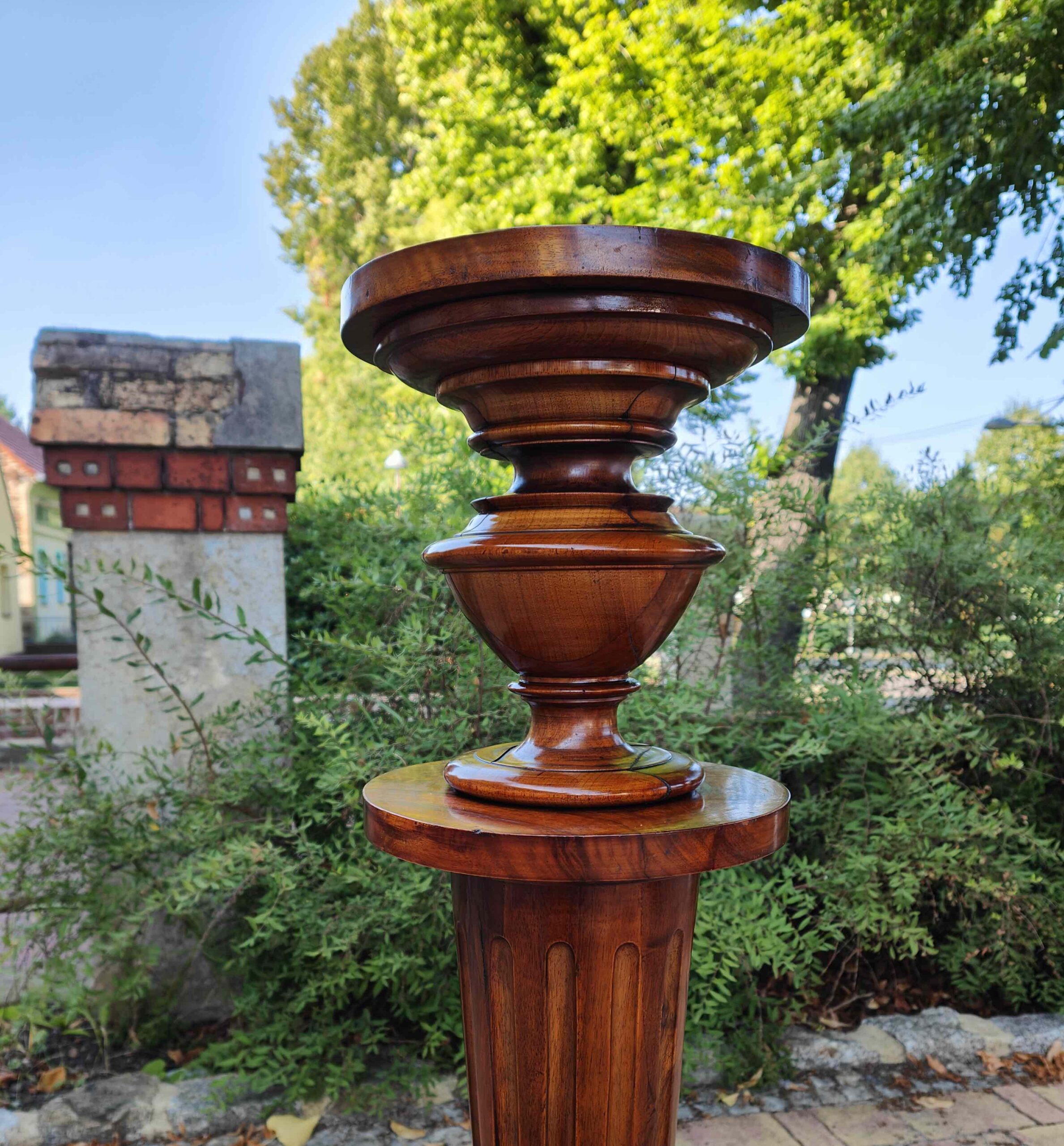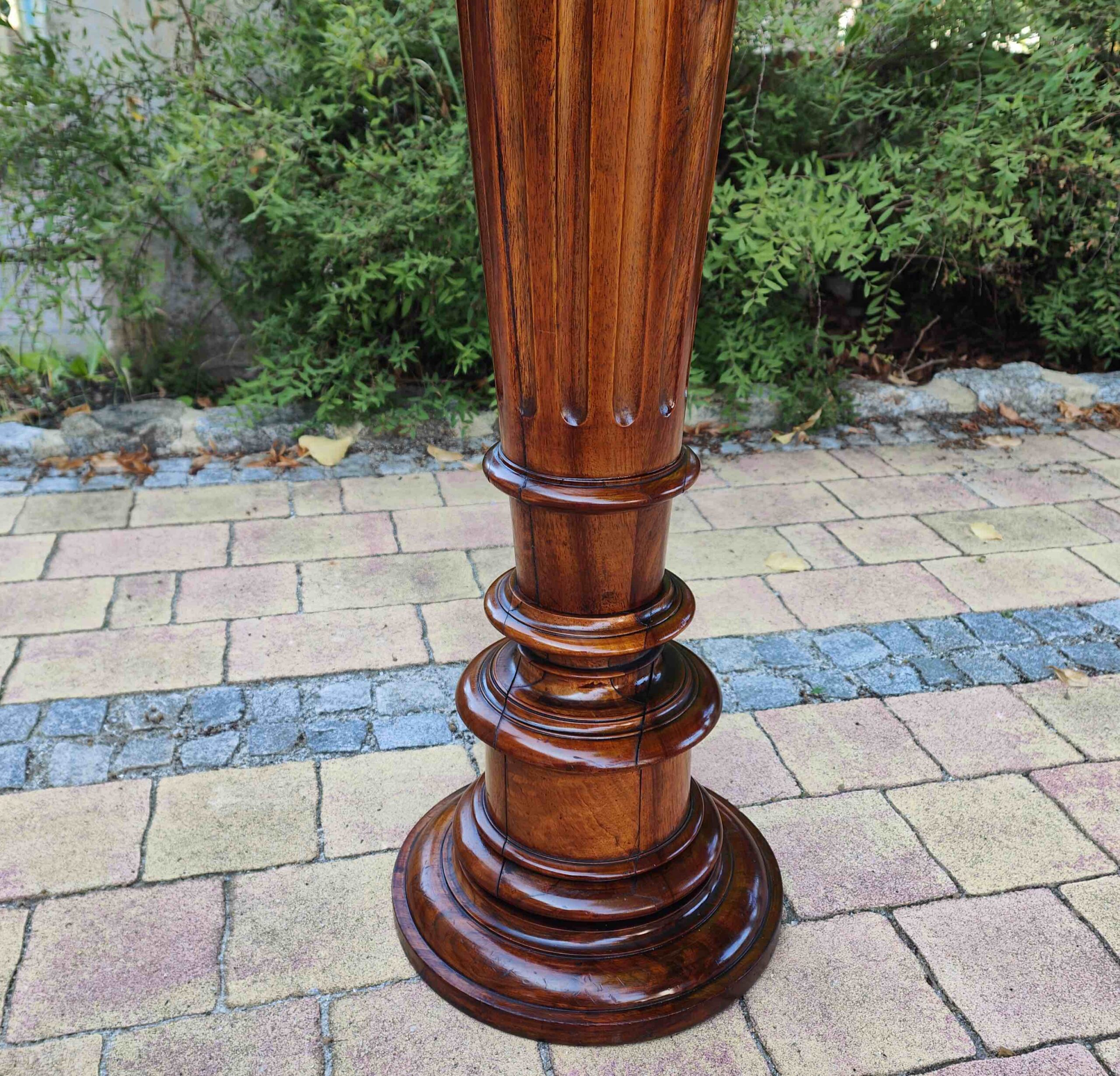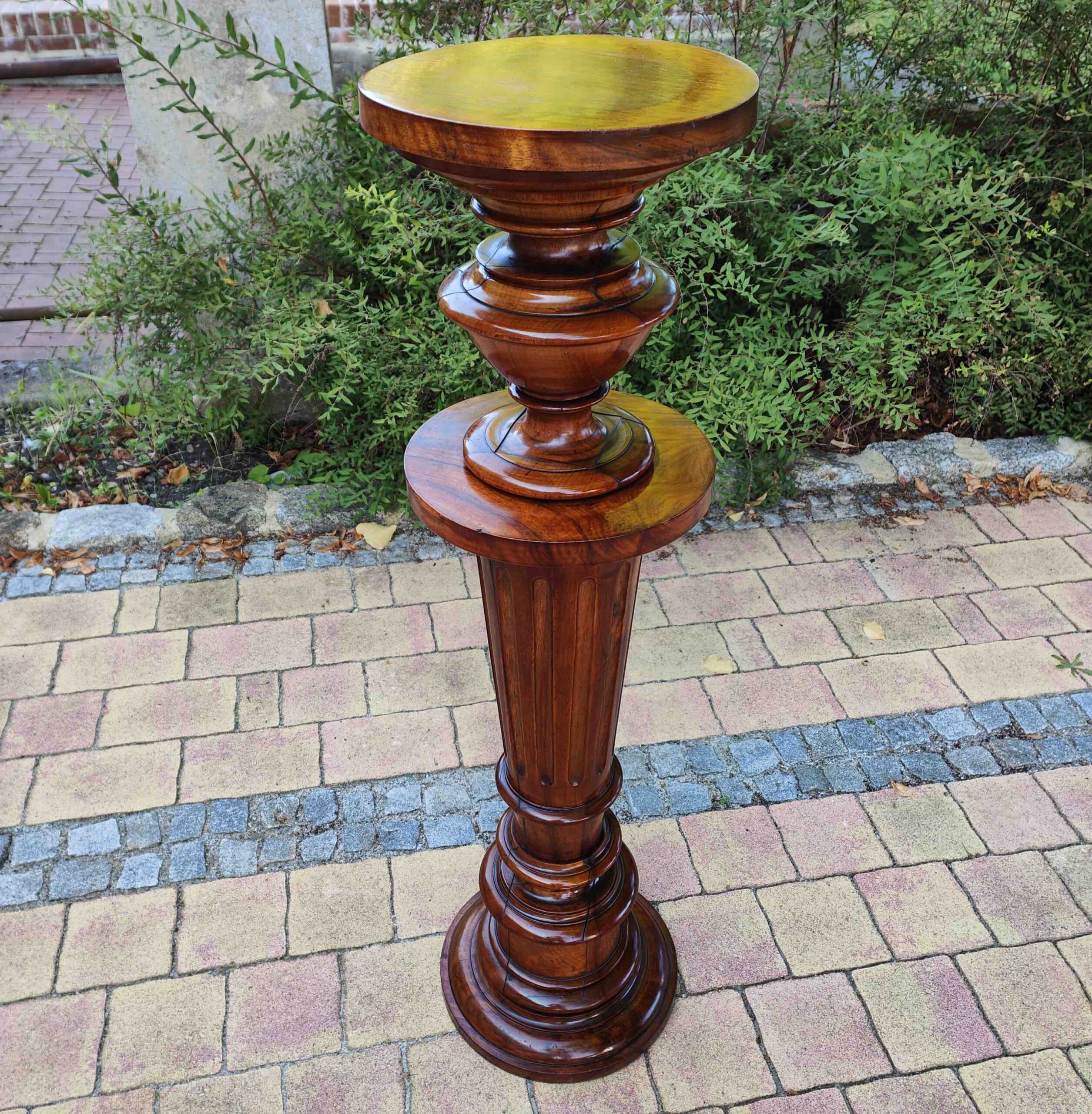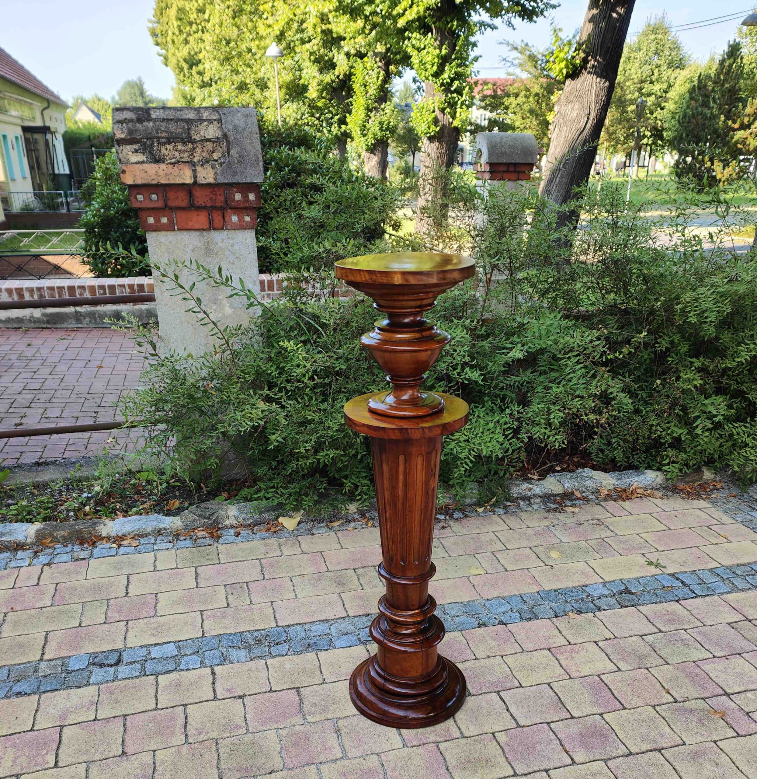 Aus massivem Nussbaum gefertigtes Postament aus der Gründerzeit, mit typischer kannelierter Säulenform und vasenartigem Fuß- und Kapitellabschluss. Derartige Stücke dienten im gehobenen bürgerlichen Interieur als Standfläche für Büsten, Skulpturen oder größere Pflanzengefäße. Die Verarbeitung zeigt eine präzise handwerkliche Ausführung und eine gut erhaltene, lebendige Holzmaserung.