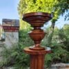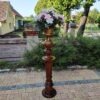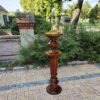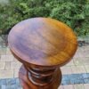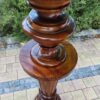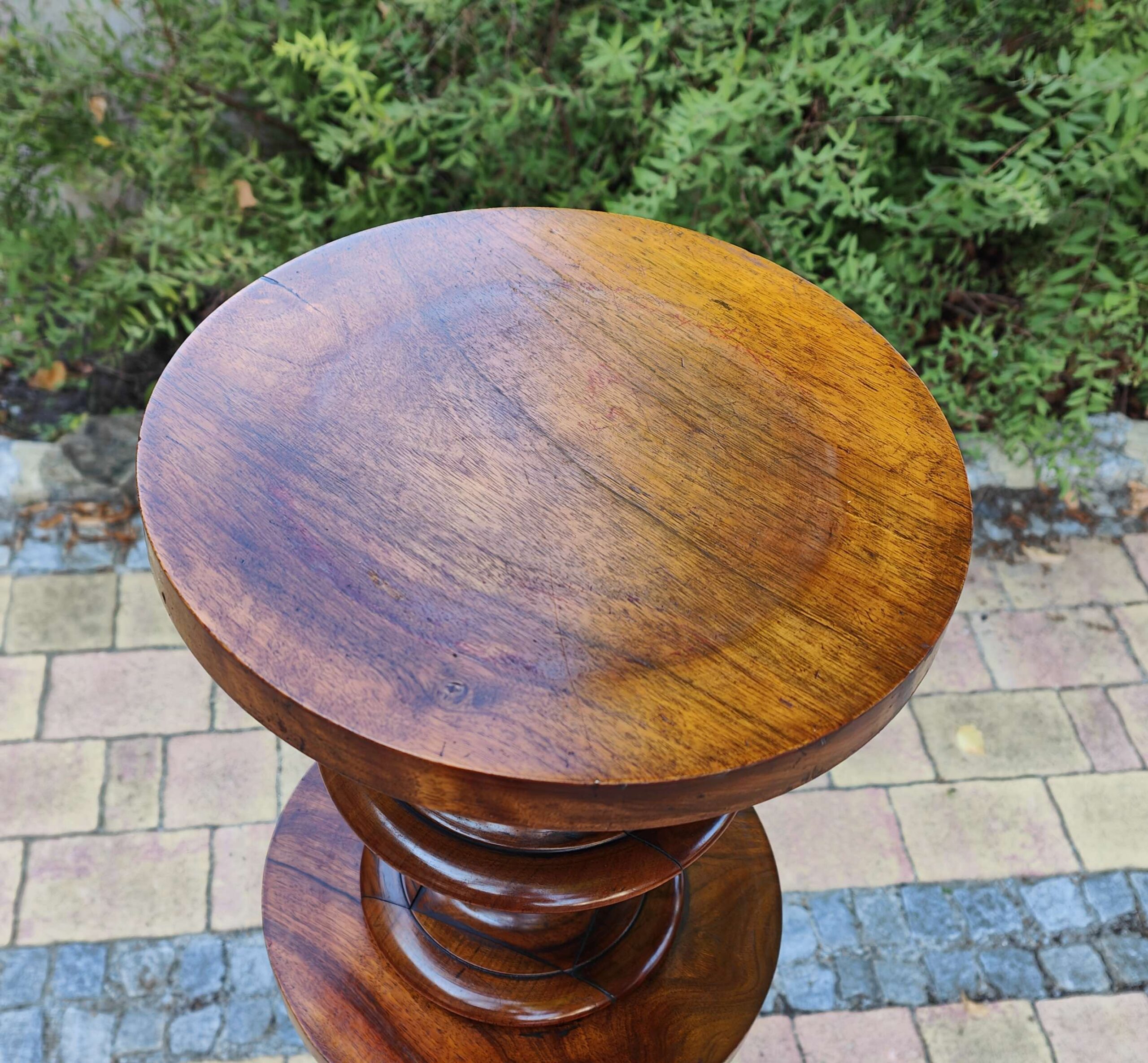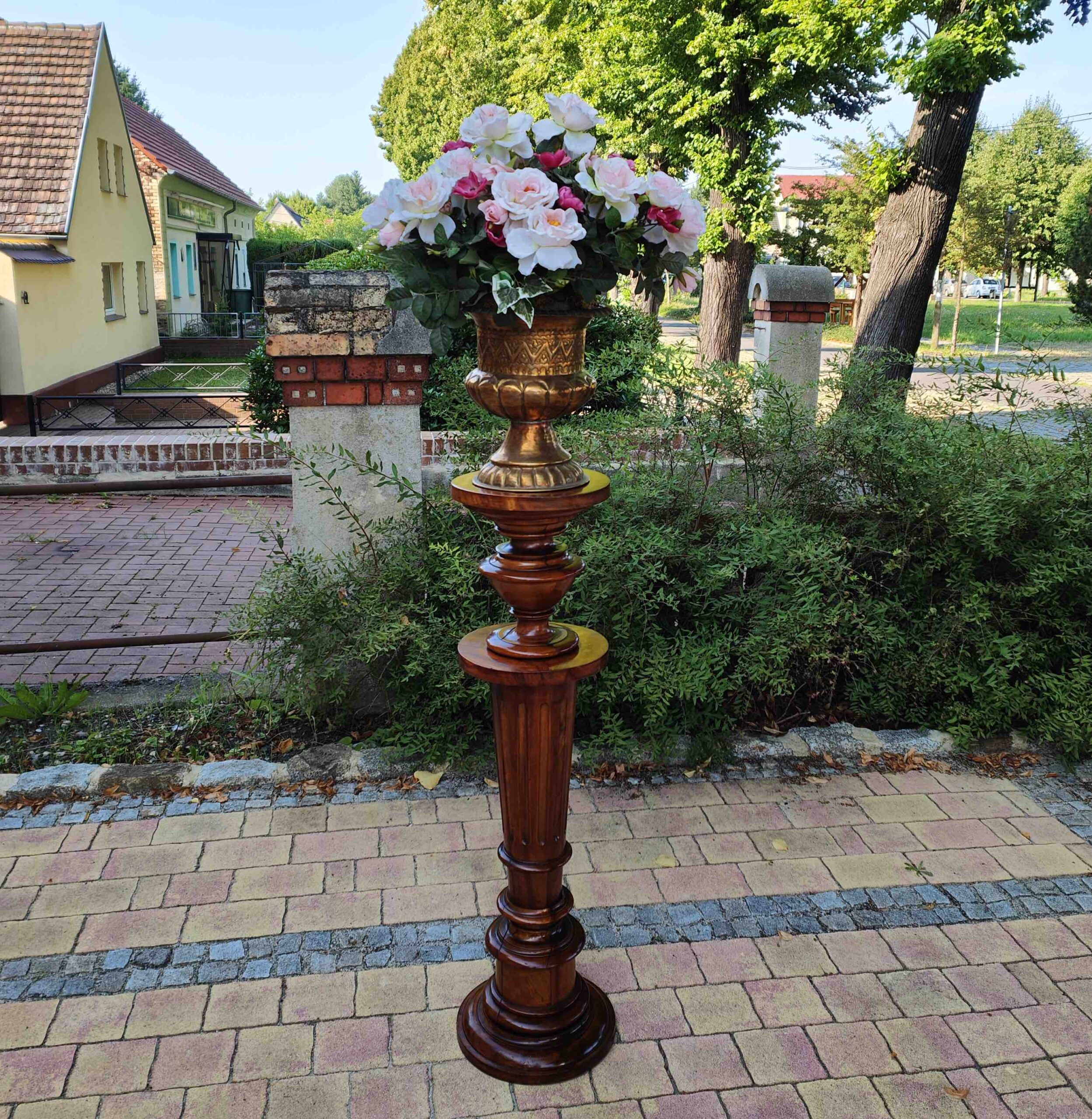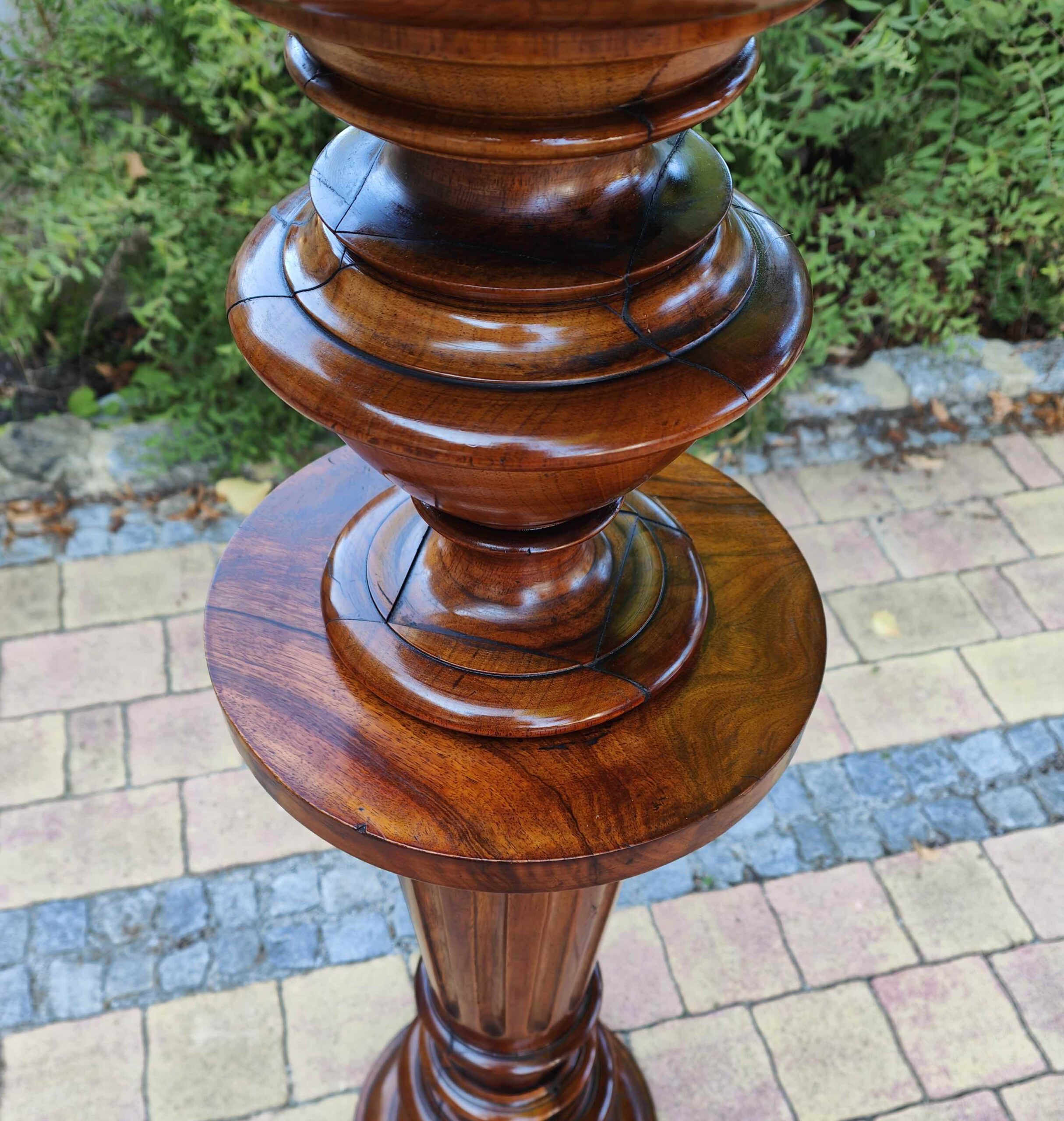 Aus massivem Nussbaum gefertigtes Postament aus der Gründerzeit, mit typischer kannelierter Säulenform und vasenartigem Fuß- und Kapitellabschluss. Derartige Stücke dienten im gehobenen bürgerlichen Interieur als Standfläche für Büsten, Skulpturen oder größere Pflanzengefäße. Die Verarbeitung zeigt eine präzise handwerkliche Ausführung und eine gut erhaltene, lebendige Holzmaserung.