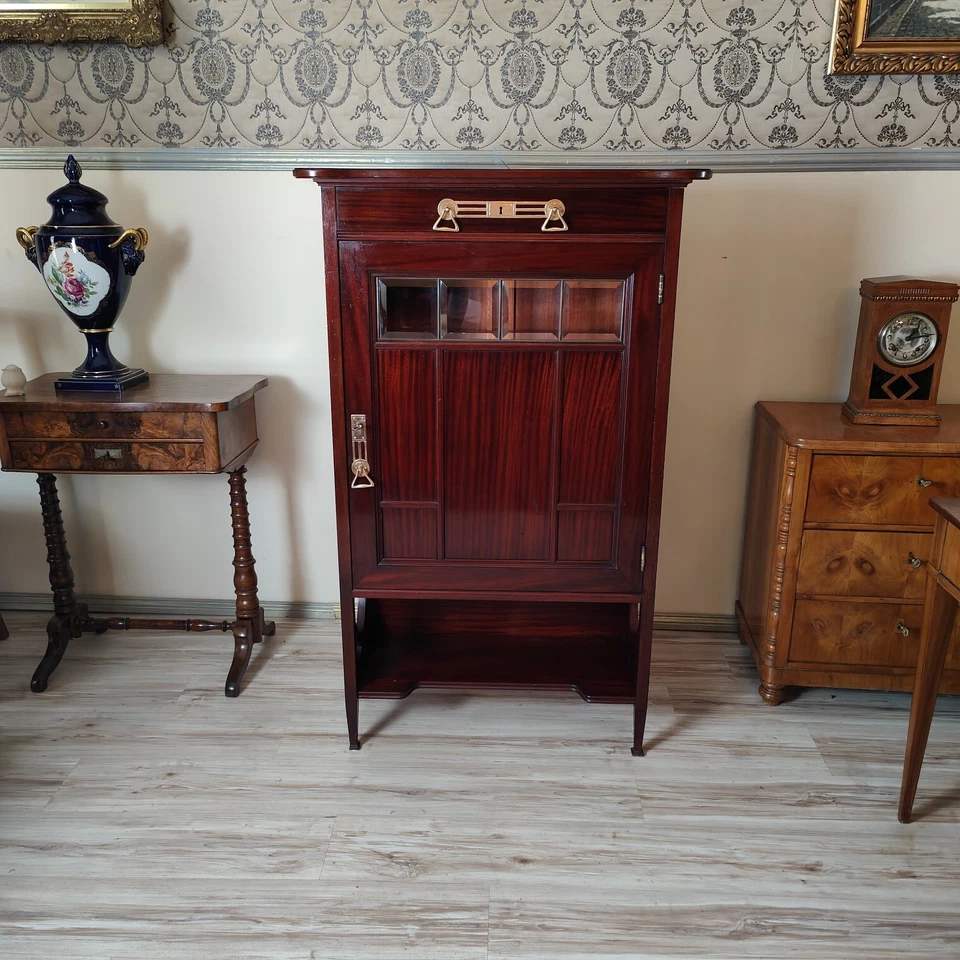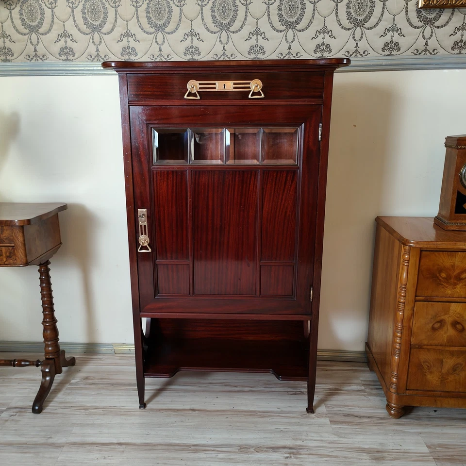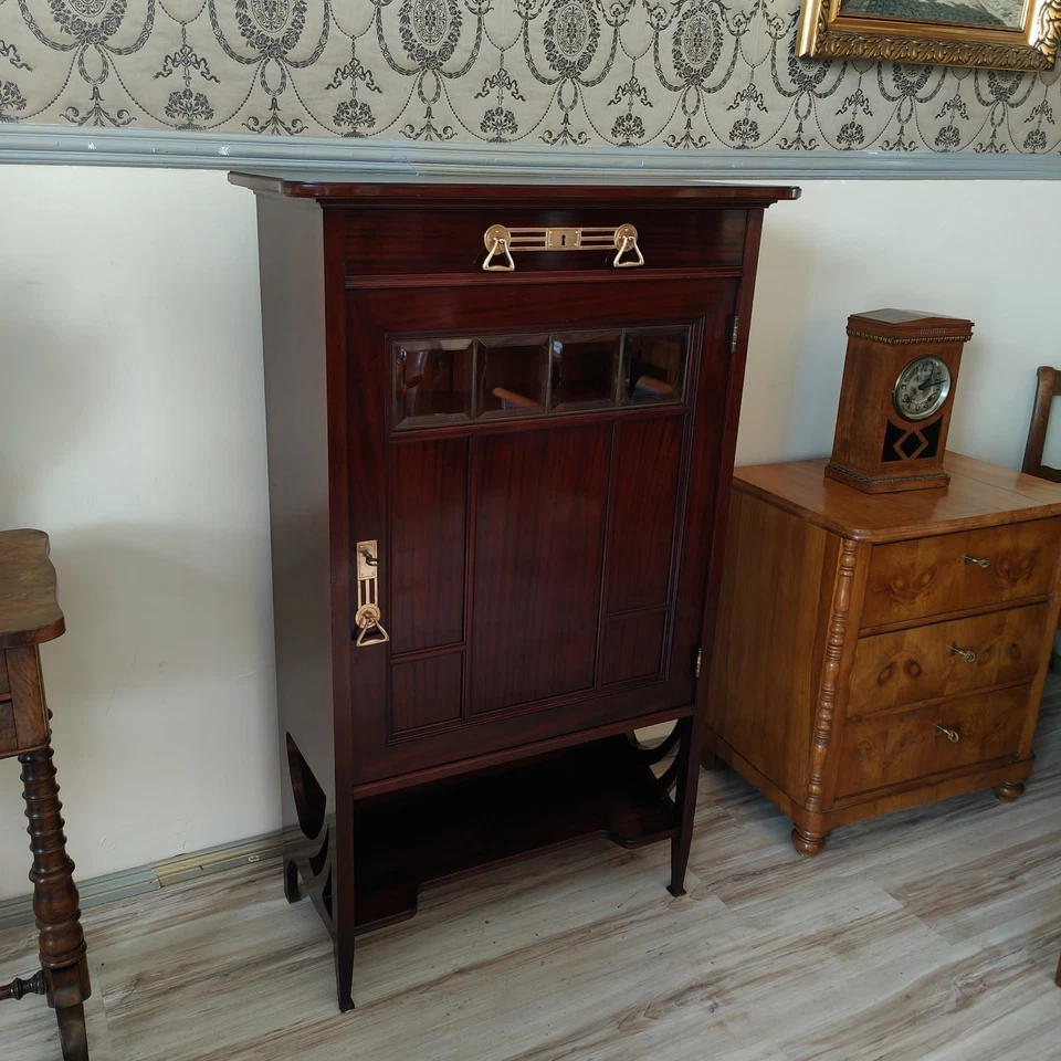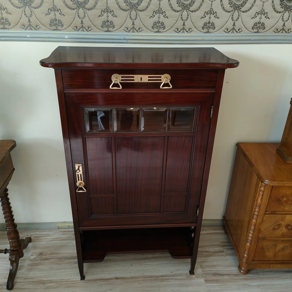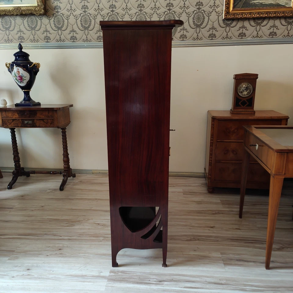 Zierliches Jugendstil Vertiko, gefertigt aus massivem Mahagoni und ausdrucksstarkem Mahagonifurnier auf soliden Eichenbrettern von der Hofmöbelfabrik Georg Müller Baden-Baden.