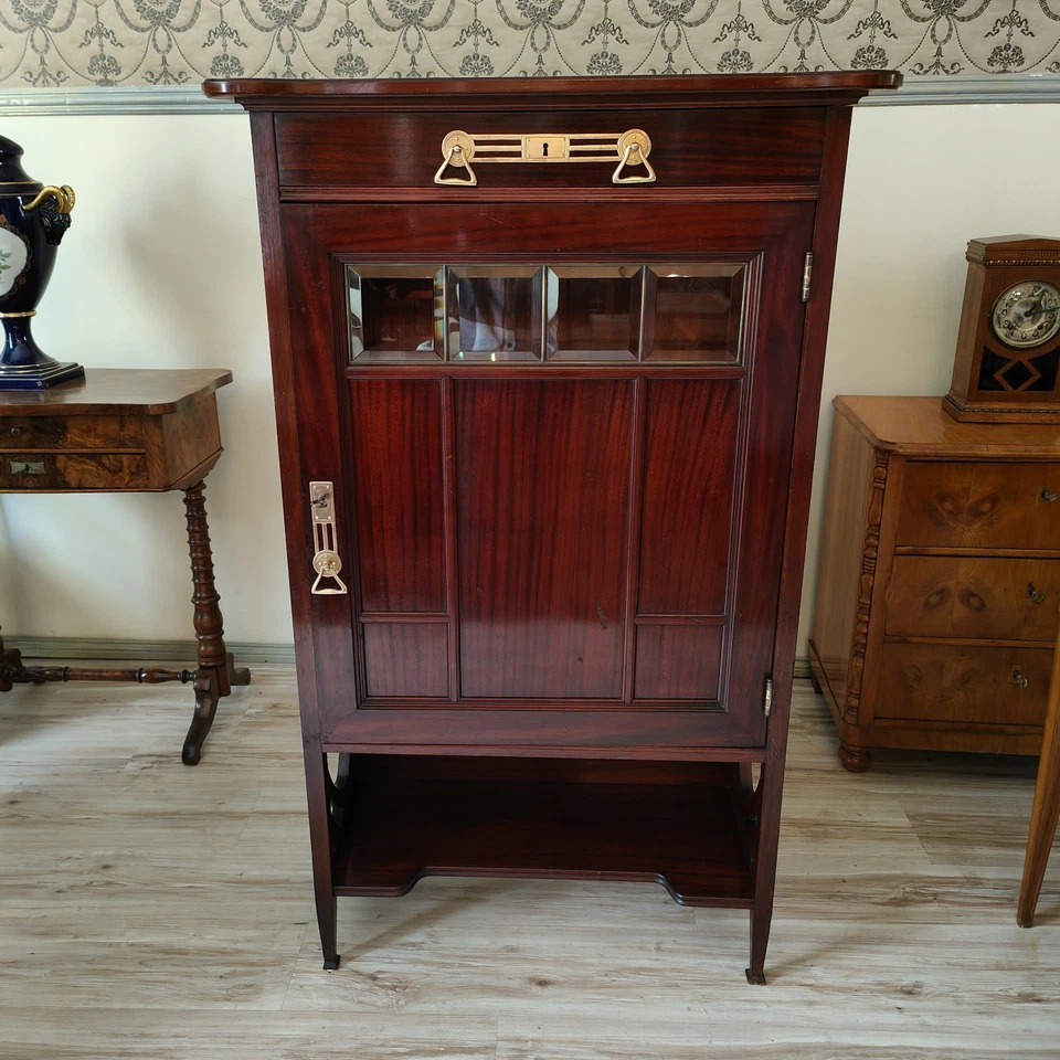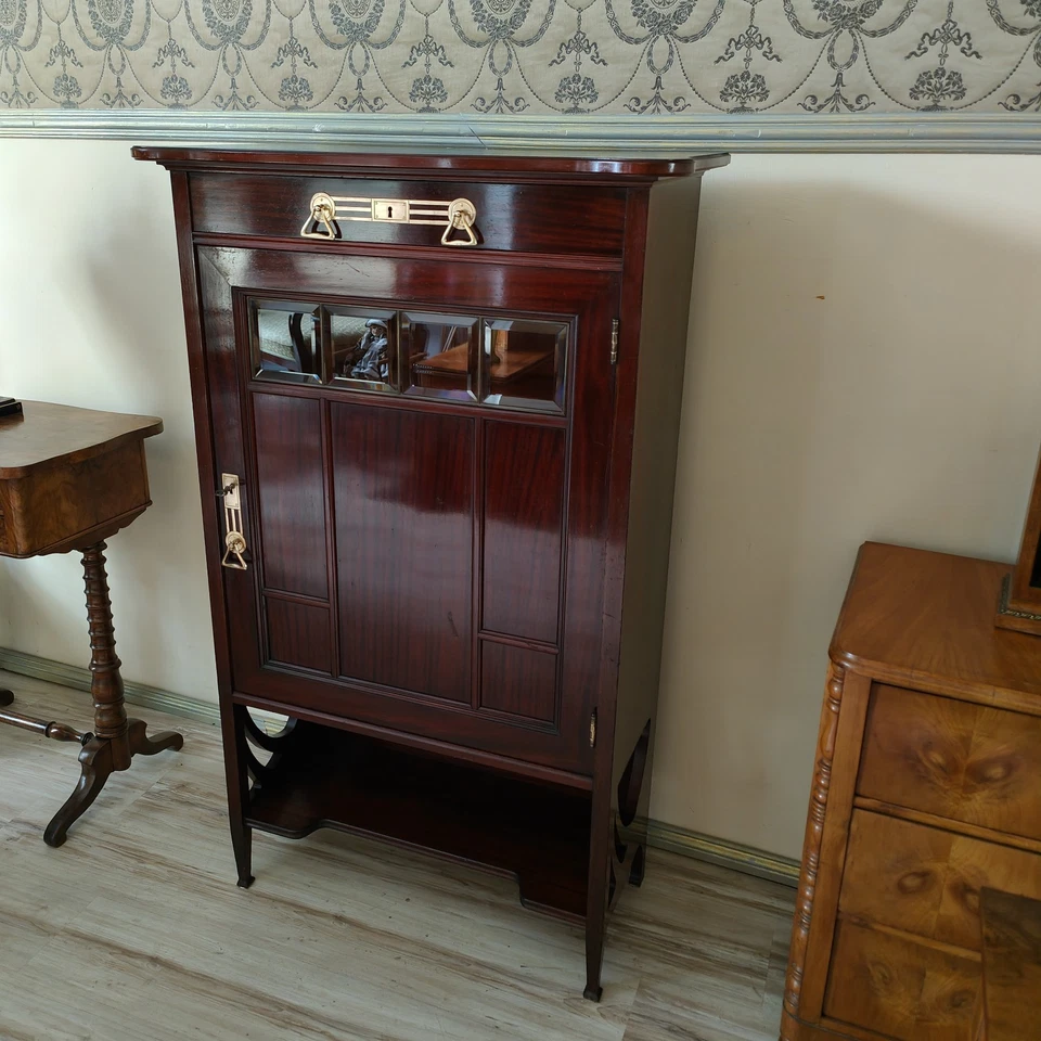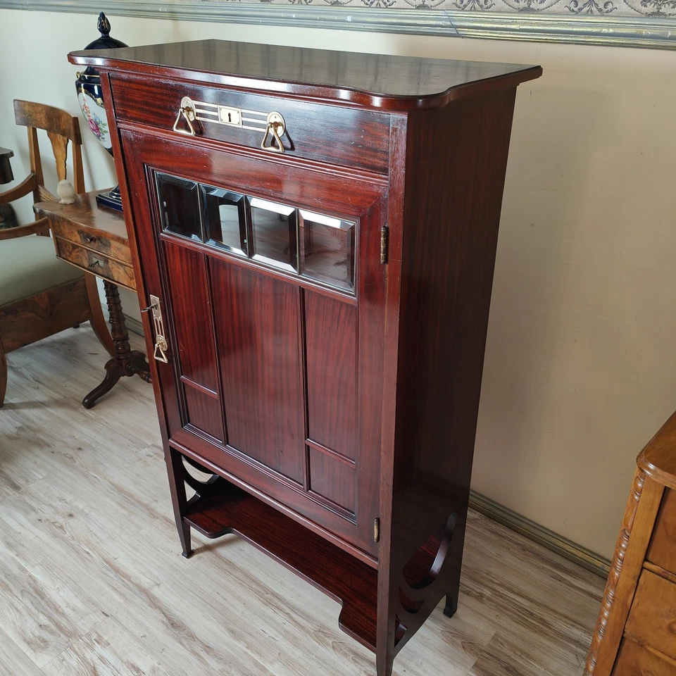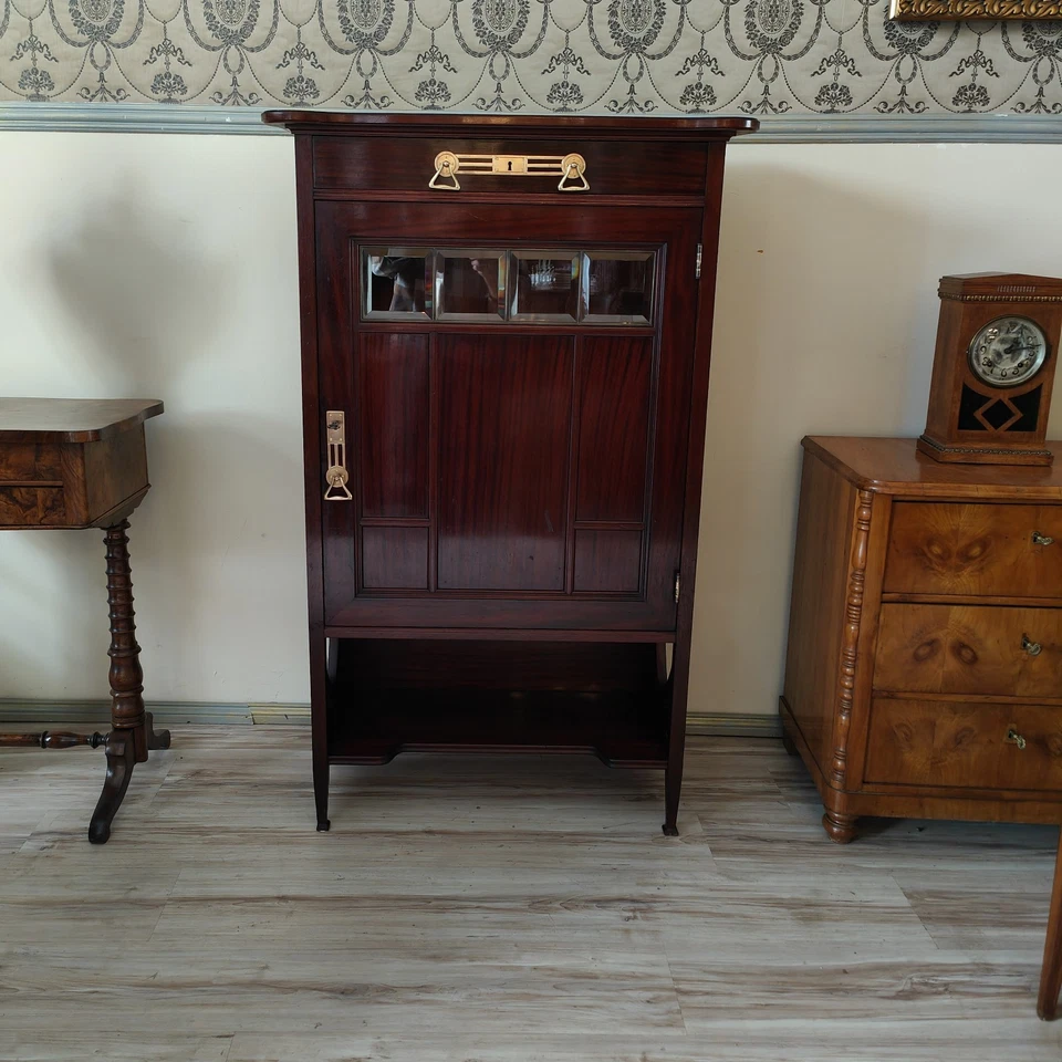 Zierliches Jugendstil Vertiko, gefertigt aus massivem Mahagoni und ausdrucksstarkem Mahagonifurnier auf soliden Eichenbrettern von der Hofmöbelfabrik Georg Müller Baden-Baden.