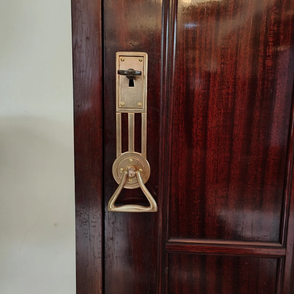 Die außergewöhnliche Messingbeschläge wurden in Handarbeit gefertigt. Die geschliffenen Scheiben sind in Messing gefasst.