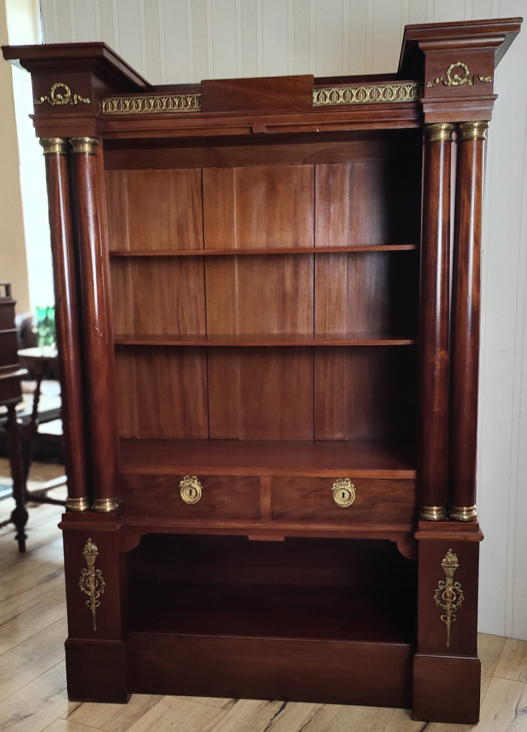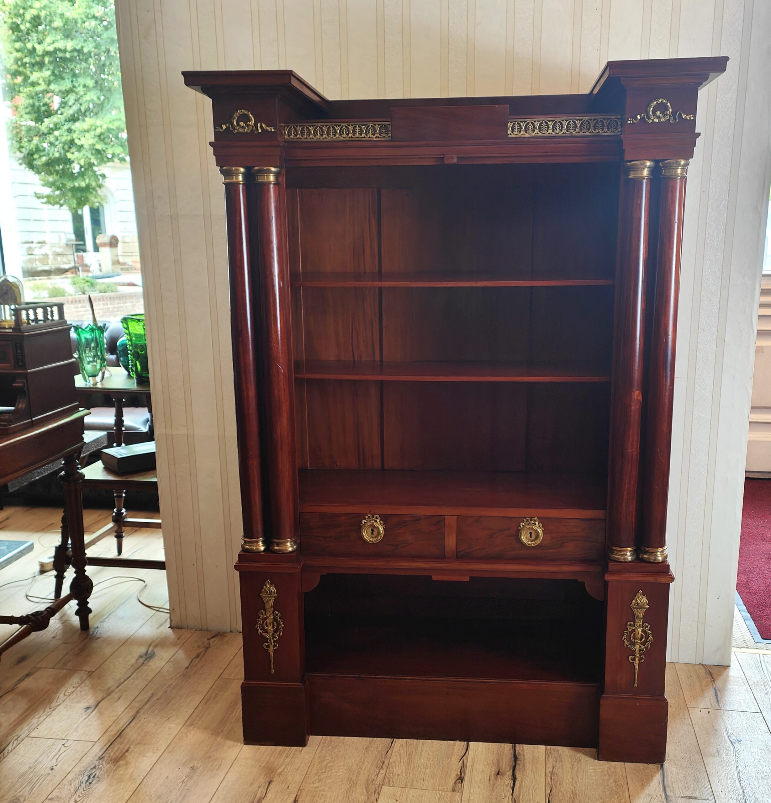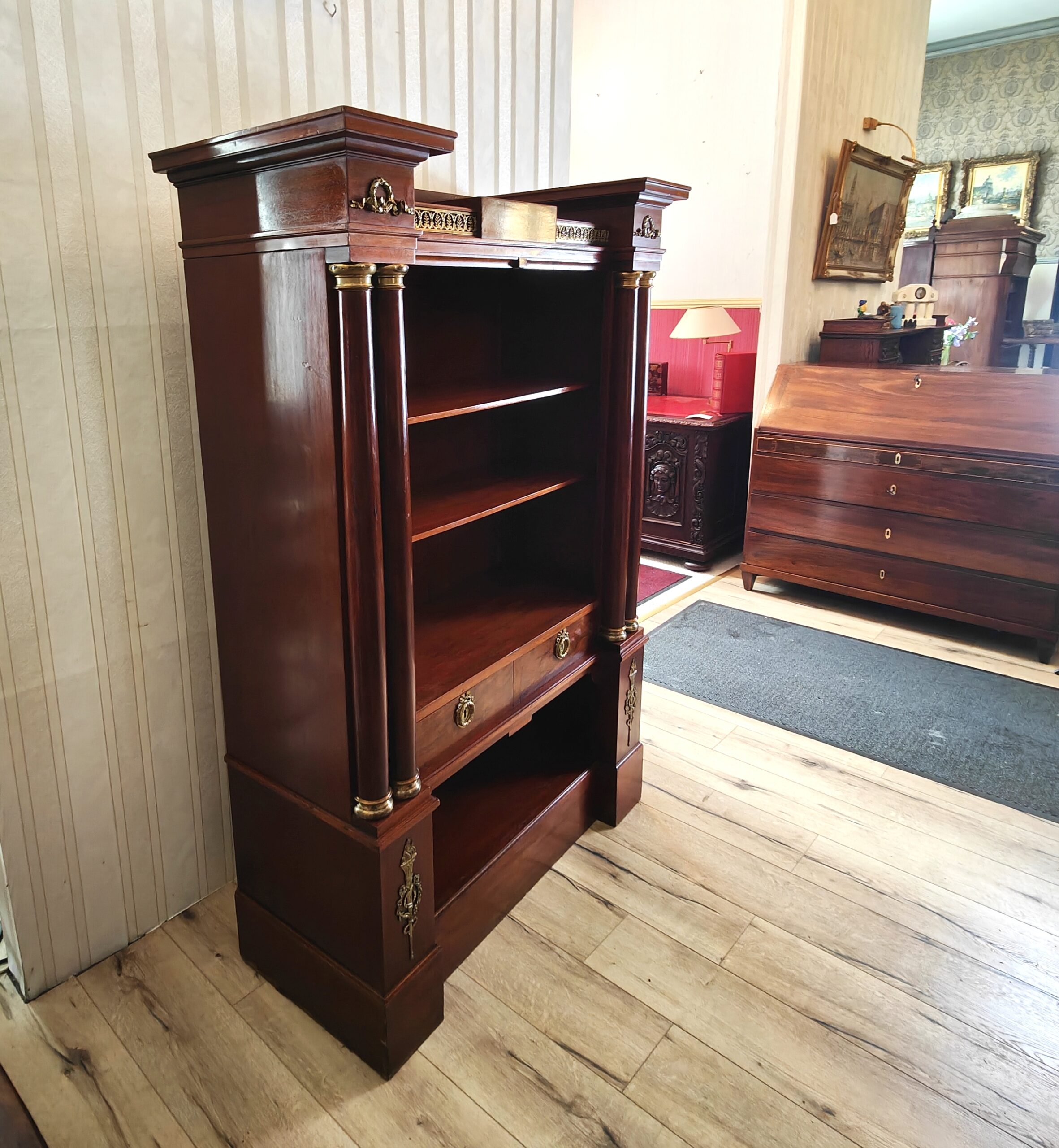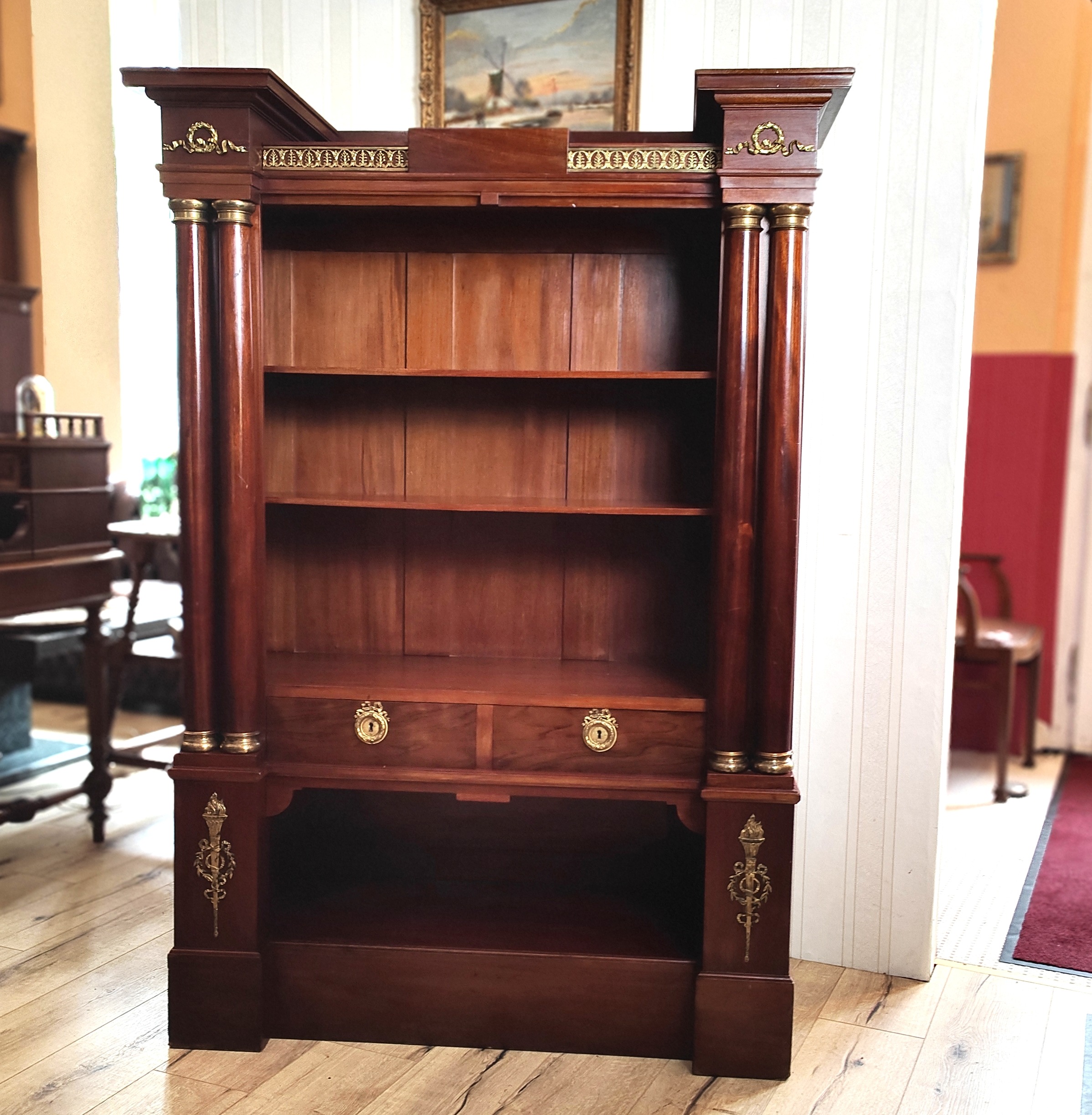 Seltenes Regal, gefertigt um 1900, im Stil des Empire. Korpus aus rötlich schimmerndem Mahagoni, die Front gegliedert durch vier schlanke Vollsäulen mit vergoldeten Kapitellen. Hochwertige, ornamental gearbeitete Bronze-Beschläge nach klassizistischen Vorbildern um 1800.