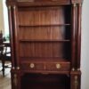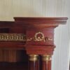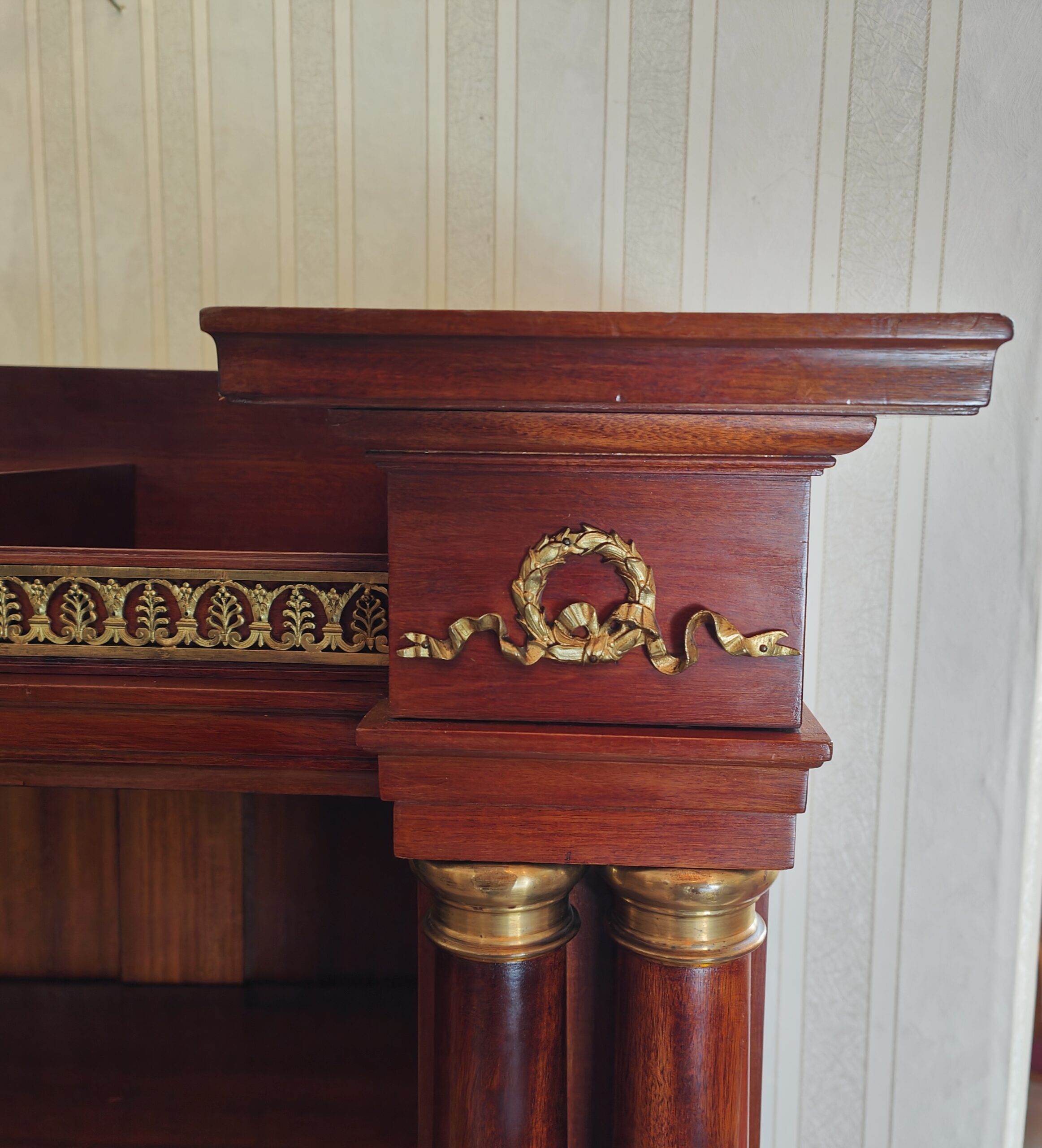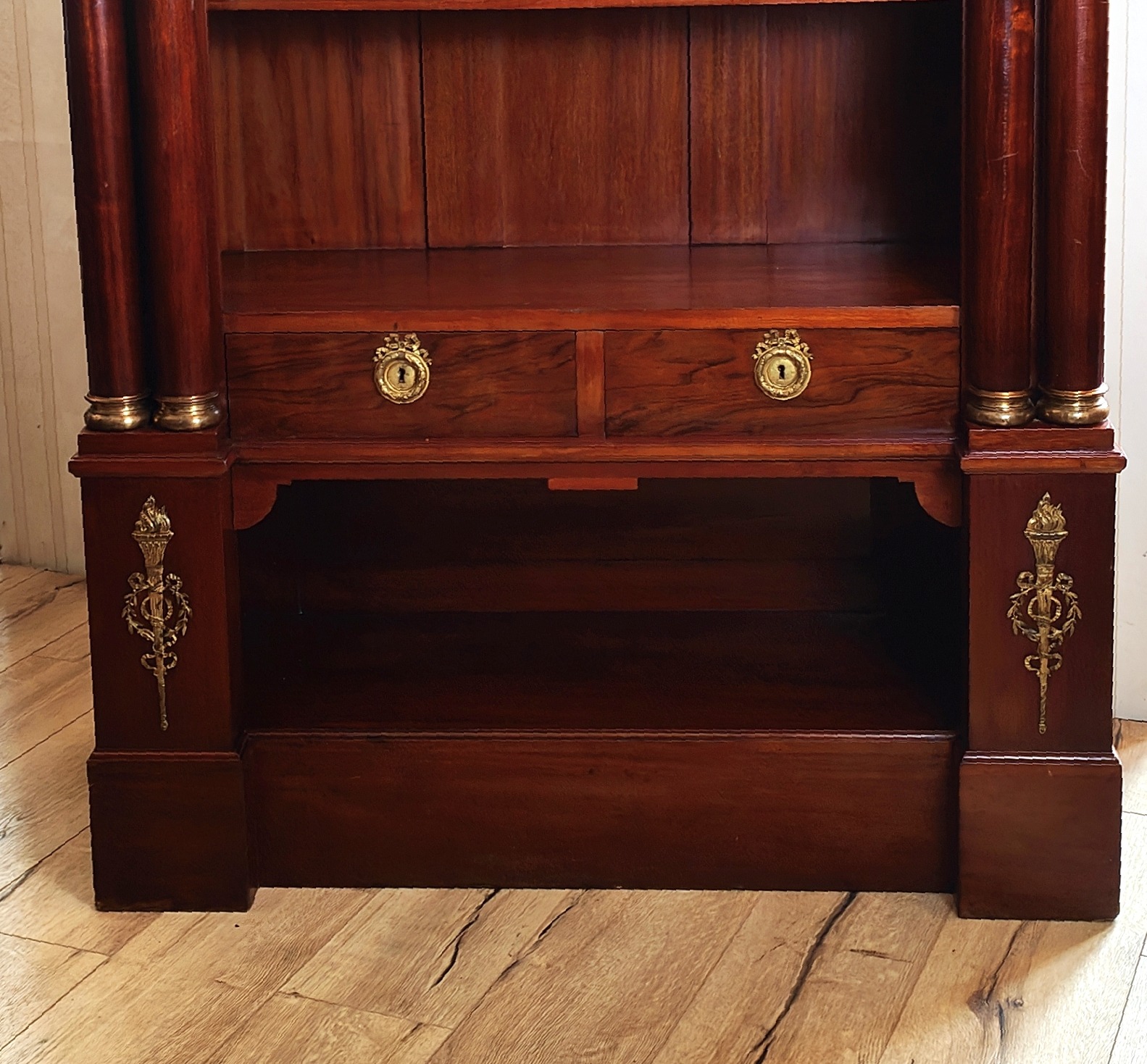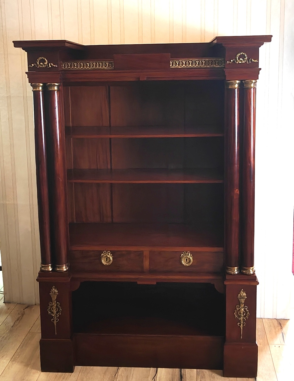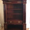 Seltenes Regal, gefertigt um 1900, im Stil des Empire. Korpus aus rötlich schimmerndem Mahagoni, die Front gegliedert durch vier schlanke Vollsäulen mit vergoldeten Kapitellen. Hochwertige, ornamental gearbeitete Bronze-Beschläge nach klassizistischen Vorbildern um 1800.