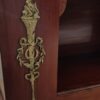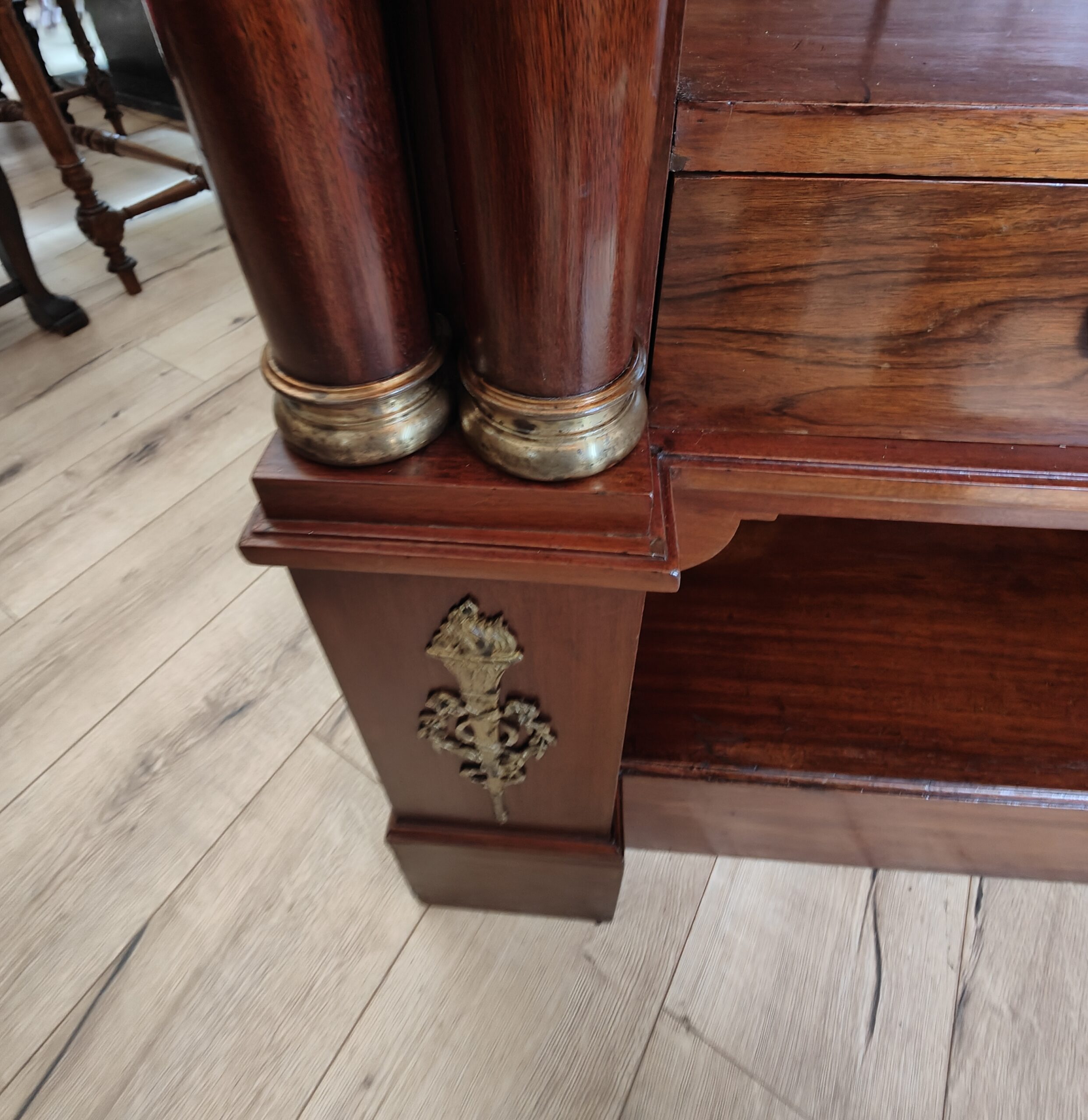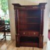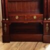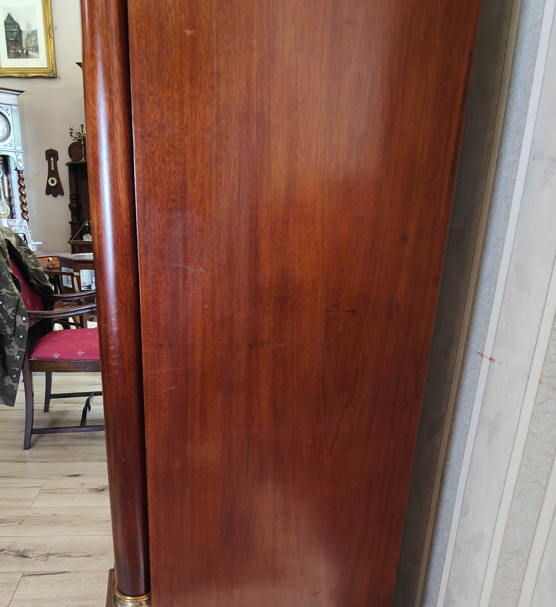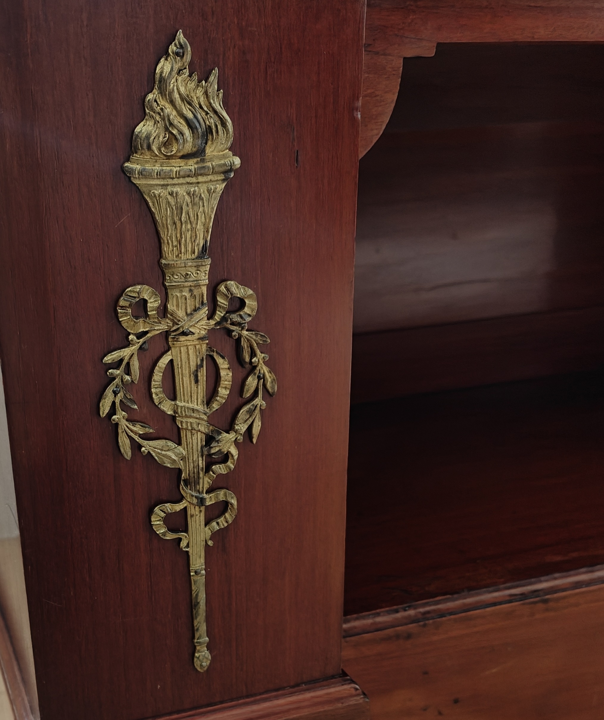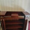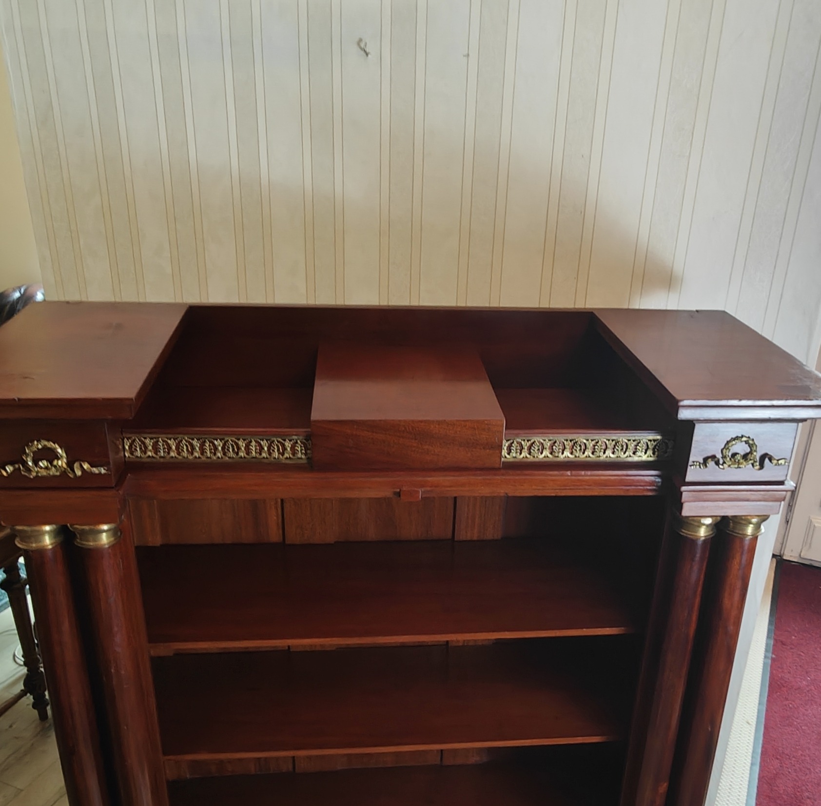 Seltenes Regal, gefertigt um 1900, im Stil des Empire. Korpus aus rötlich schimmerndem Mahagoni, die Front gegliedert durch vier schlanke Vollsäulen mit vergoldeten Kapitellen. Hochwertige, ornamental gearbeitete Bronze-Beschläge nach klassizistischen Vorbildern um 1800.