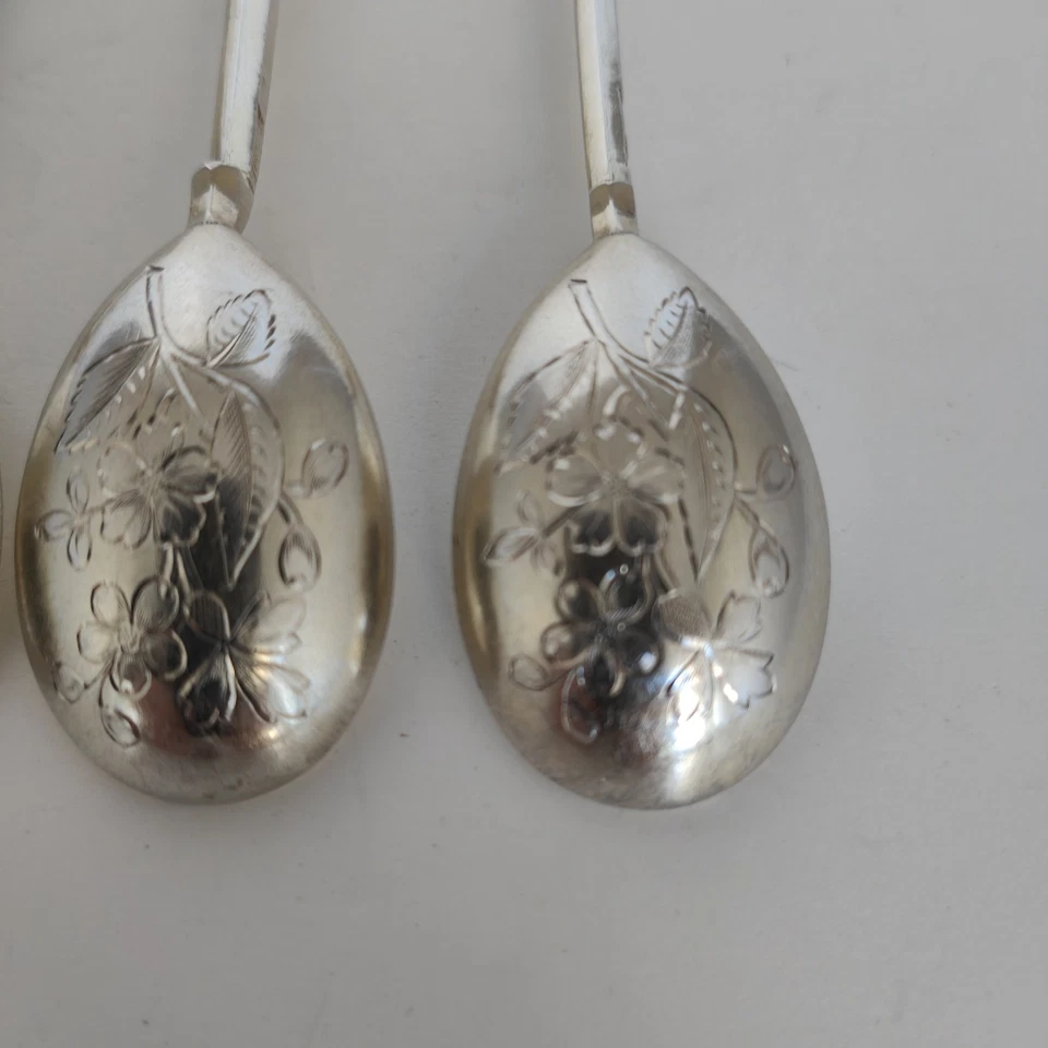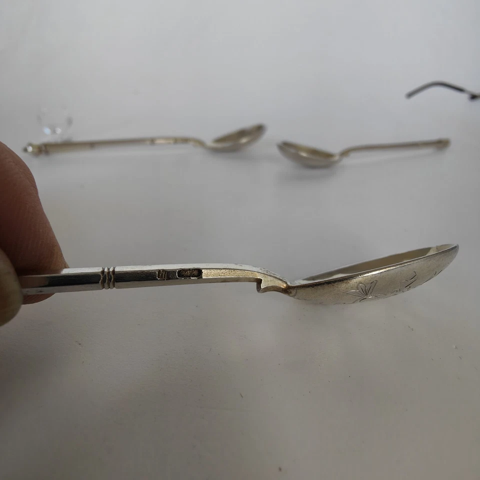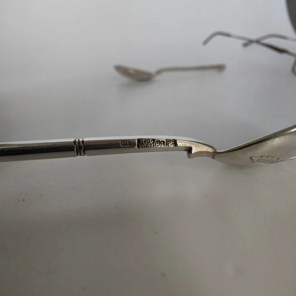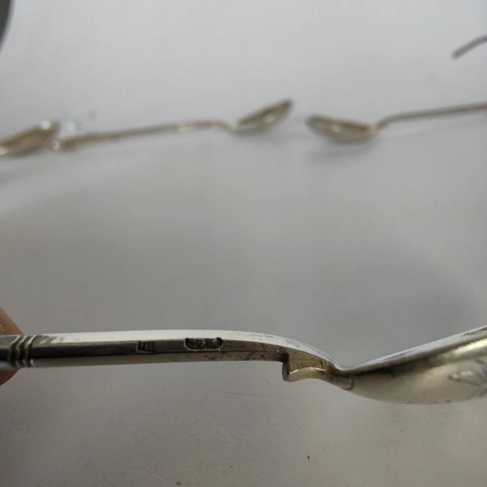 Bei den zwei gleichen Löffeln ist der Moskauer Abnahmestempel genau zu erkennen, bei den vier Löffeln ist zwar die 84 zuerkennen, aber bei den Abnahmestempeln können wir keine sichere Zuordnung machen: Schauen sie sich bitte die Bilder an.